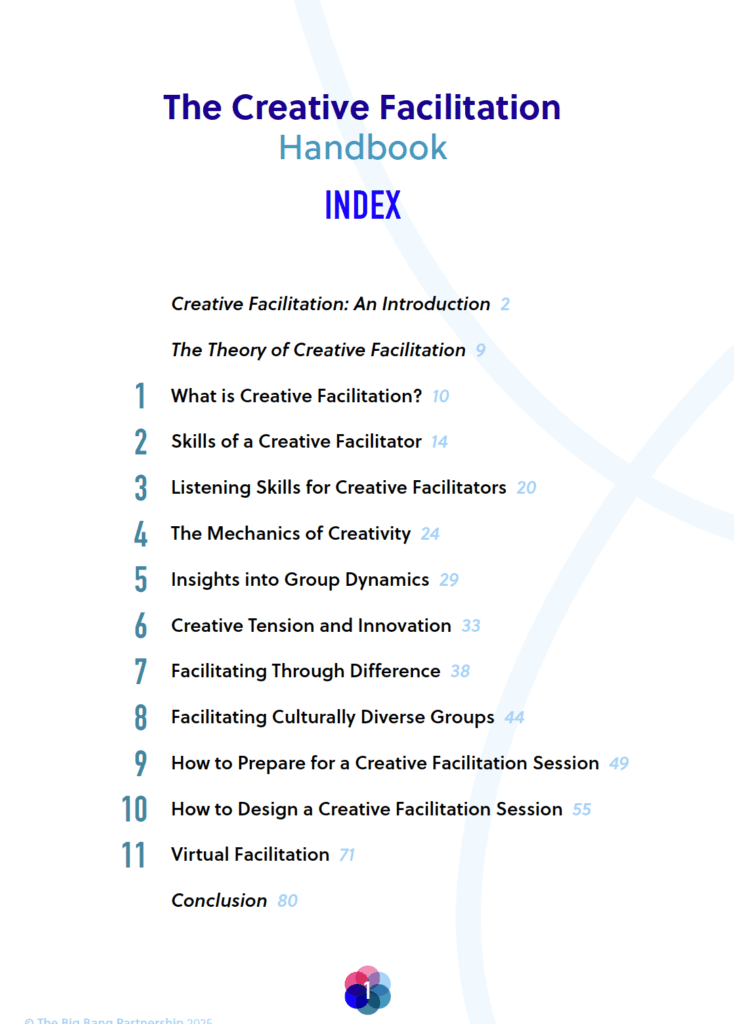 The Creative Facilitation Handbook is structured so you can dip in for a specific session, or read end-to-end as a complete guide.